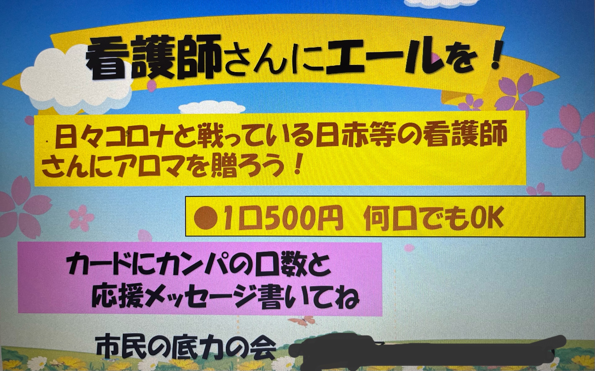 1口500円で2週間で20万円集まりました。カンパと共に応援メッセージをメッセージカードに記入してもらいました。